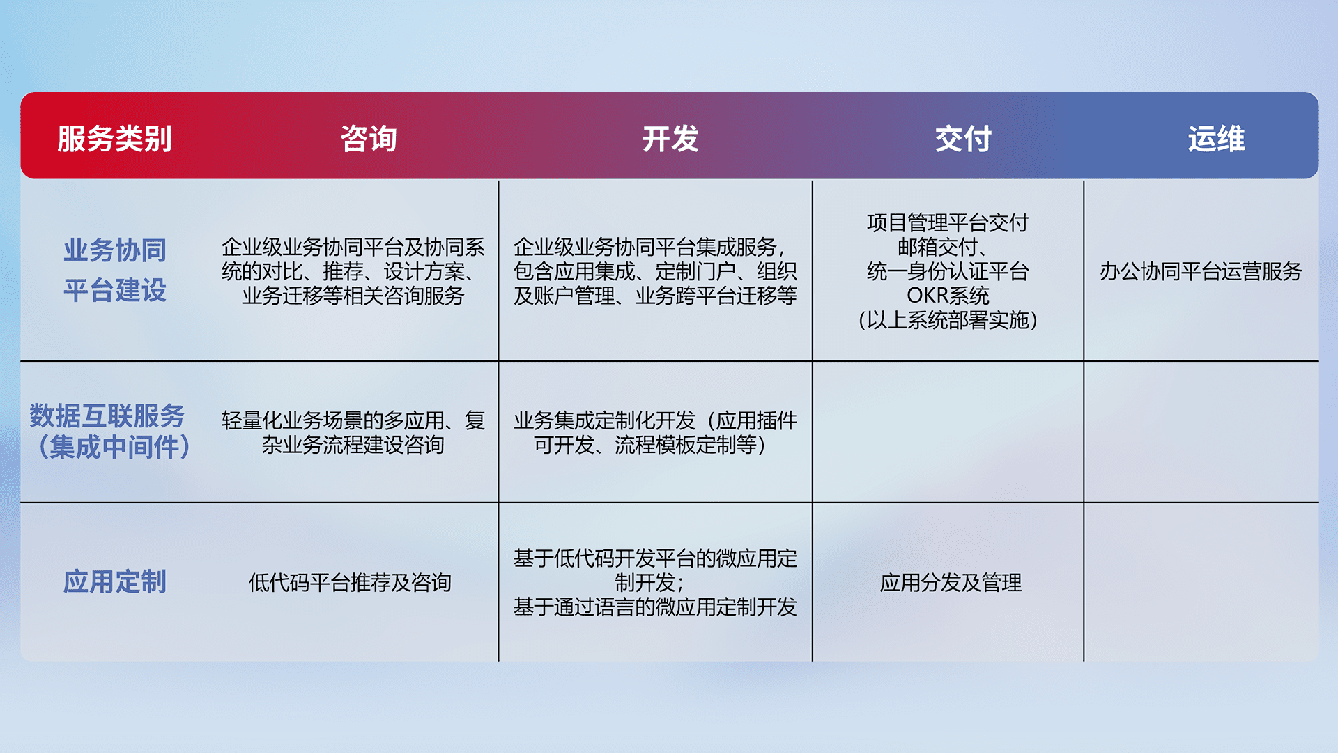 针对钉钉、、、企微、、、、IDaas等平台级产品提供产品的规划、、方案、、、、交付、、、、定制化开发等服务,,实现如统一协同办公、、、智能客户服务、、、、混合会议管理、、智能数据查询、、等业务场景,,实现数字化转型。。。。